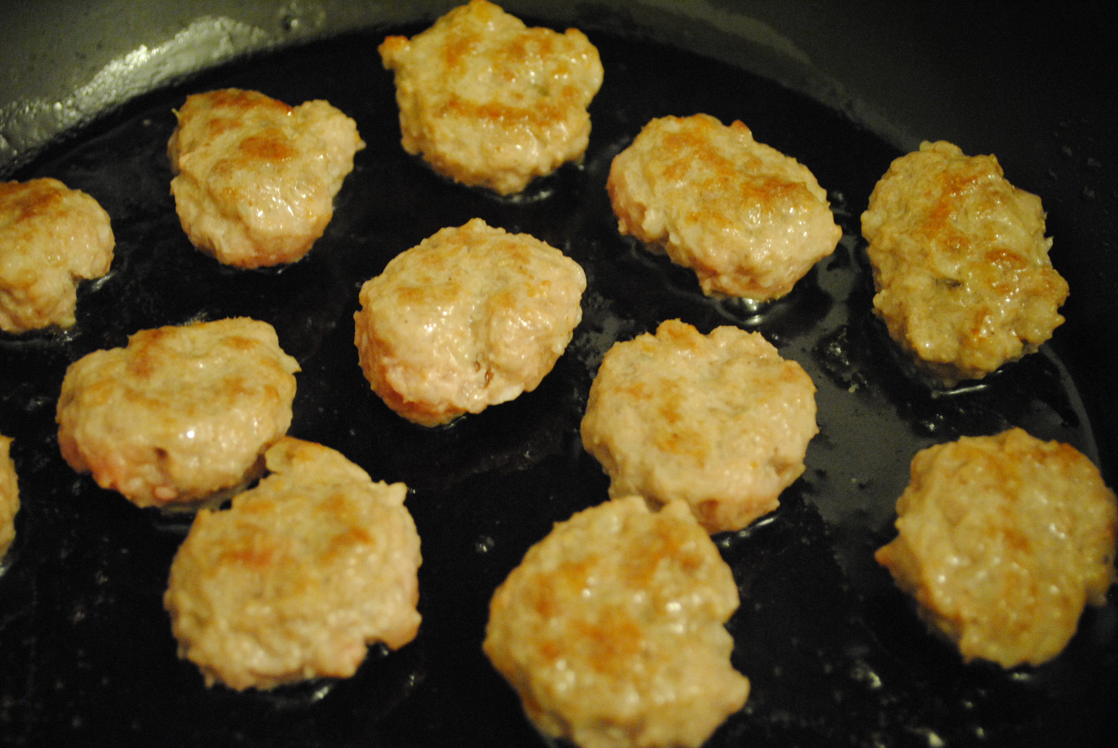 Press the sausage meat out of its casing (you may need to nick the skin with a knife), half a sausage at a time, rolling it in your hands to form a ball and then squash gently to make a little patty. You should get 12 patties from the 6 sausages. Feel free to use more sausages if you want.
