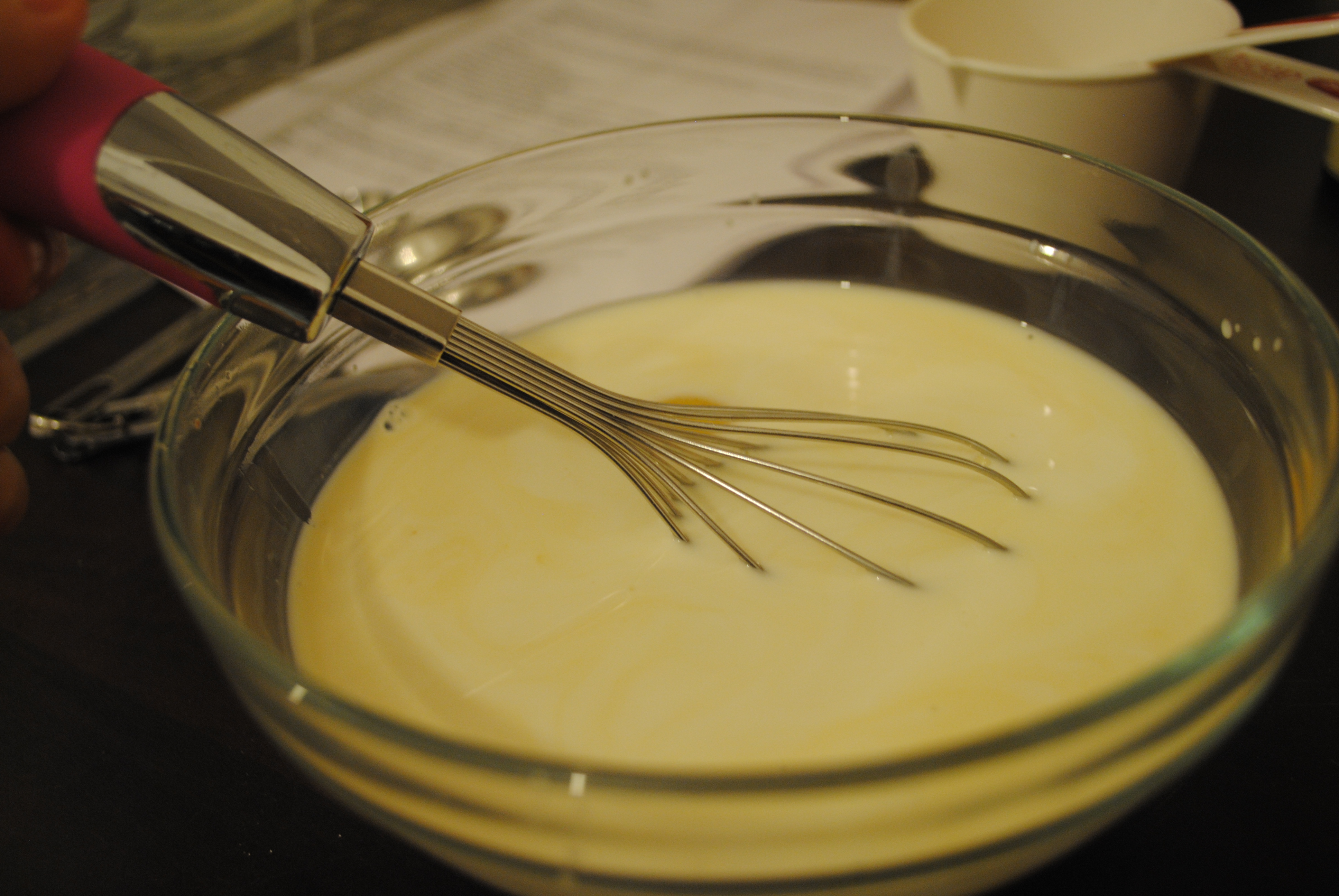 Heat oven to 350 degrees (approx 175 degrees Celsius). In a small bowl, whisk together eggs, milk and vanilla.