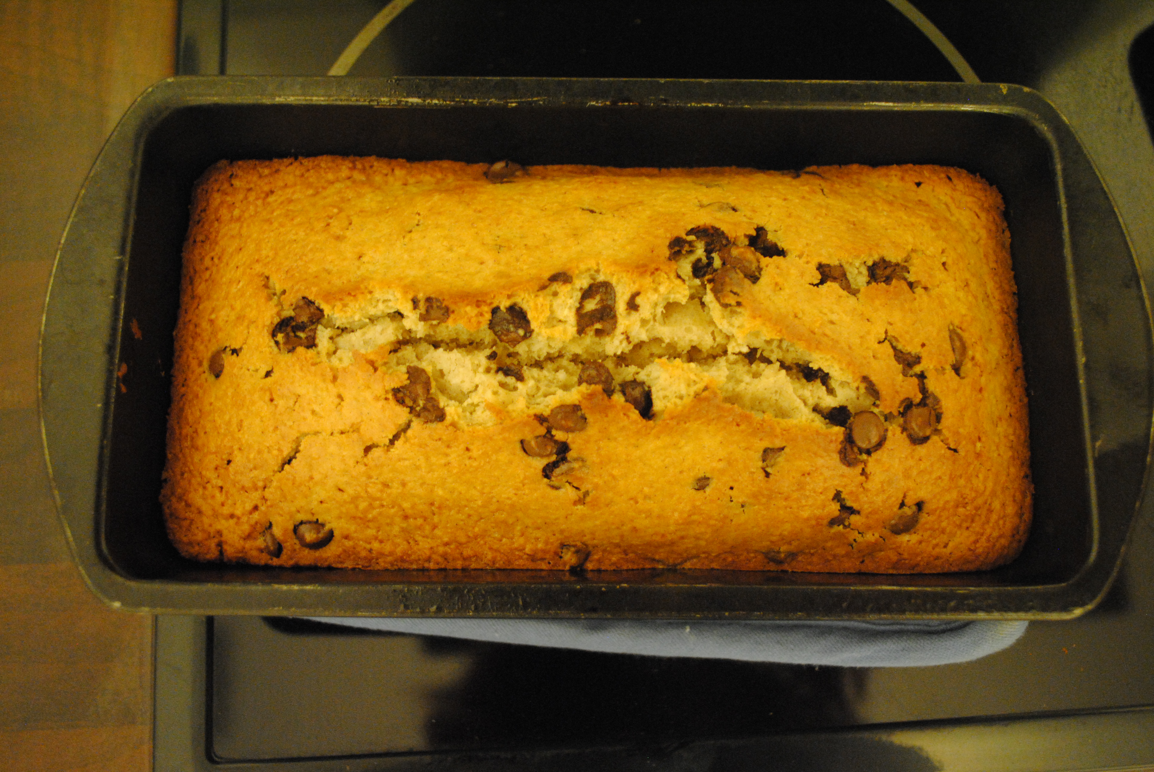 I have adapted Deb’s recipe slightly to make it coconut chocolate chip bread. This was largely inspired by my love of vanilla coconut ice cream with chocolate chips. When I lived in Atlanta, there was this amazing ice cream place called Bruster’s which made this ice cream as sort of an ‘ice cream special’ – it made it that much more exciting when they had it and I would buy a whole pint to last the week which I would subsequently eat in one evening.
