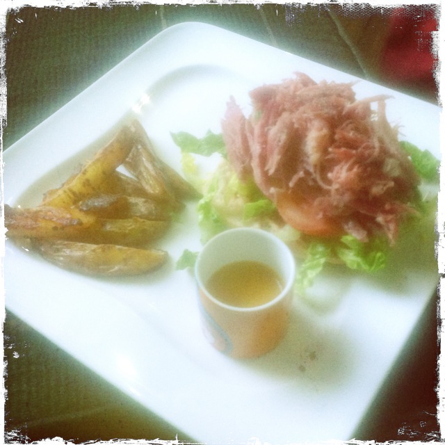 Slow roasted Suffolk ham hock served on a toasted Ciabatta with a dollop of tomato puree, little gem lettuce, sliced tomatoes and homemade potato wedges.