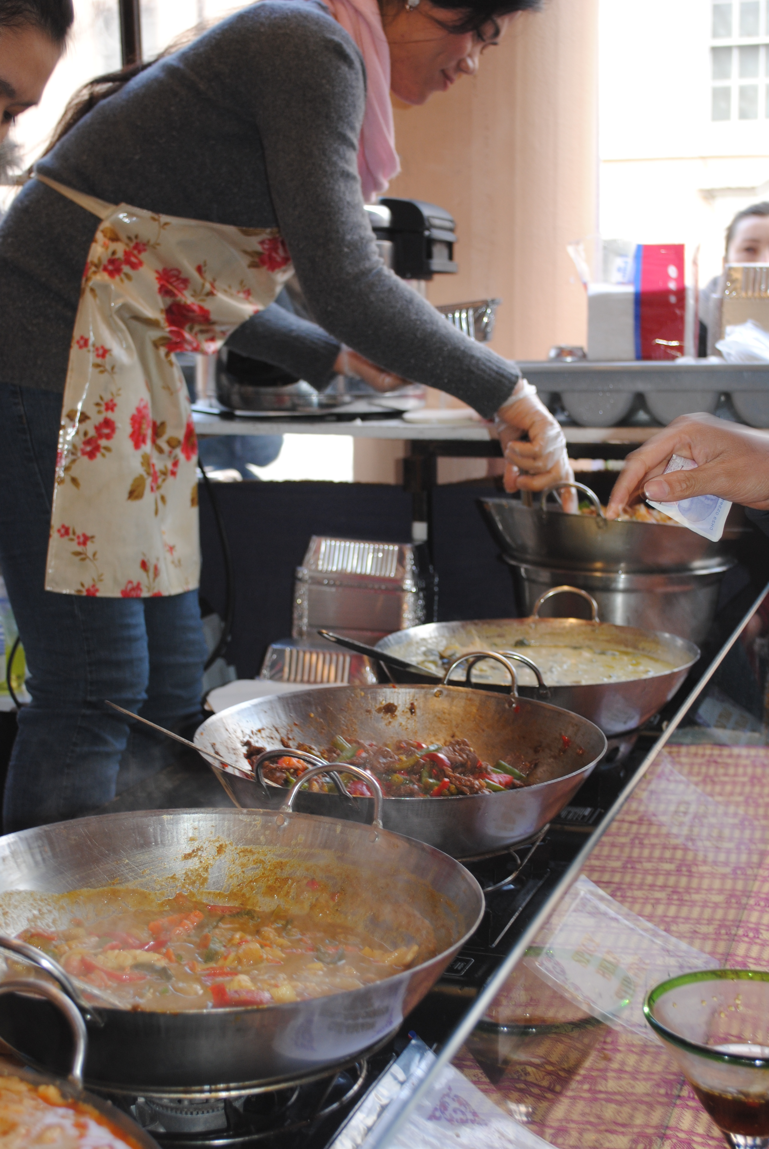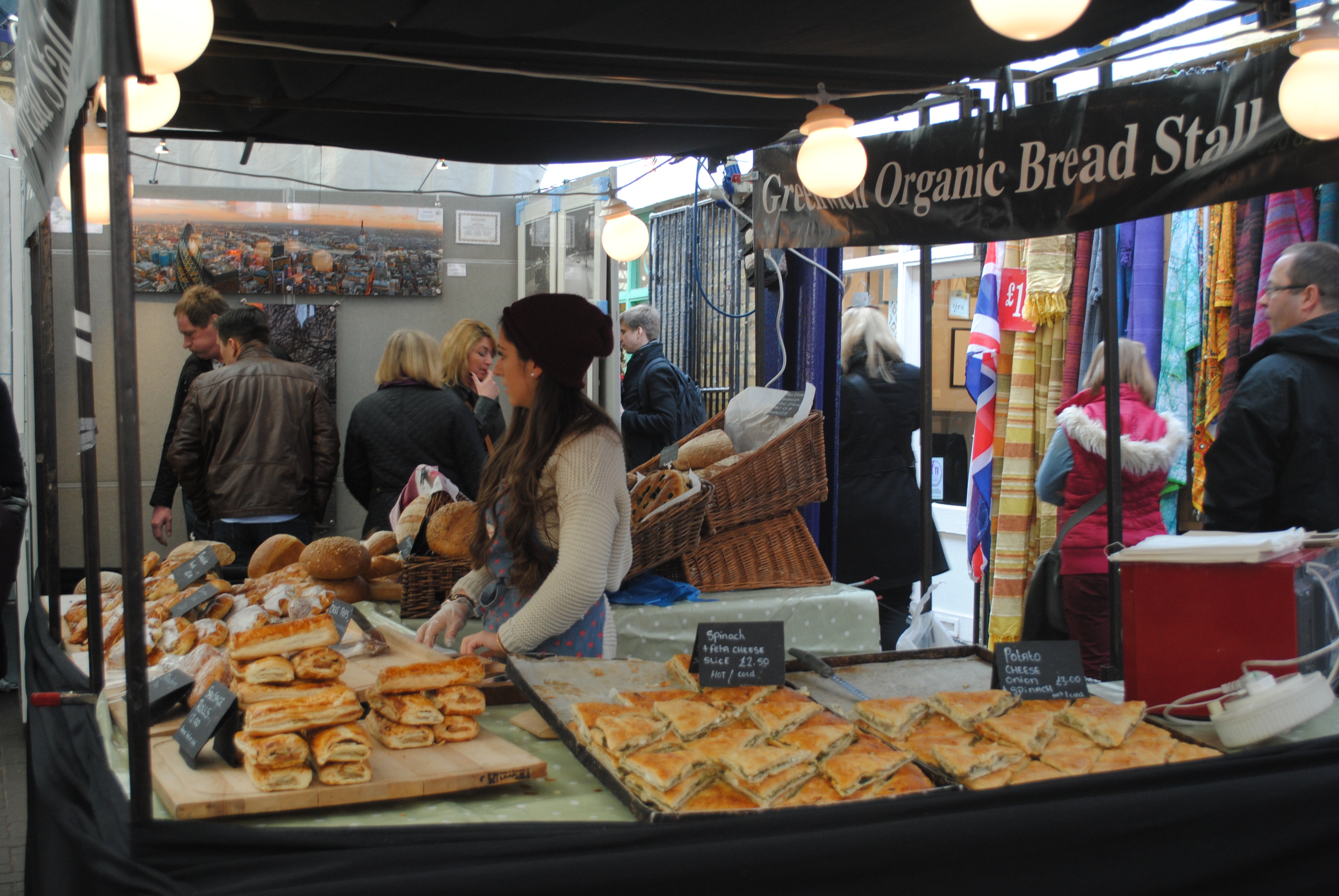 There were a number of your usual market players: Spanish Street Tapas stall serving chorizo sandwiches (with chips.. as one does in Britain), the British sandwich stall serving giant roast beef sandwiches with hot melted cheddar and rocket, French stall selling crepes, Thai stall selling some potentially promising red and green curries, and the Greenwich Organic Bread stall selling your usual baguettes, sourdough, and rye breads along with some spinach and feta cheese slices and potato, cheese and onion slices.