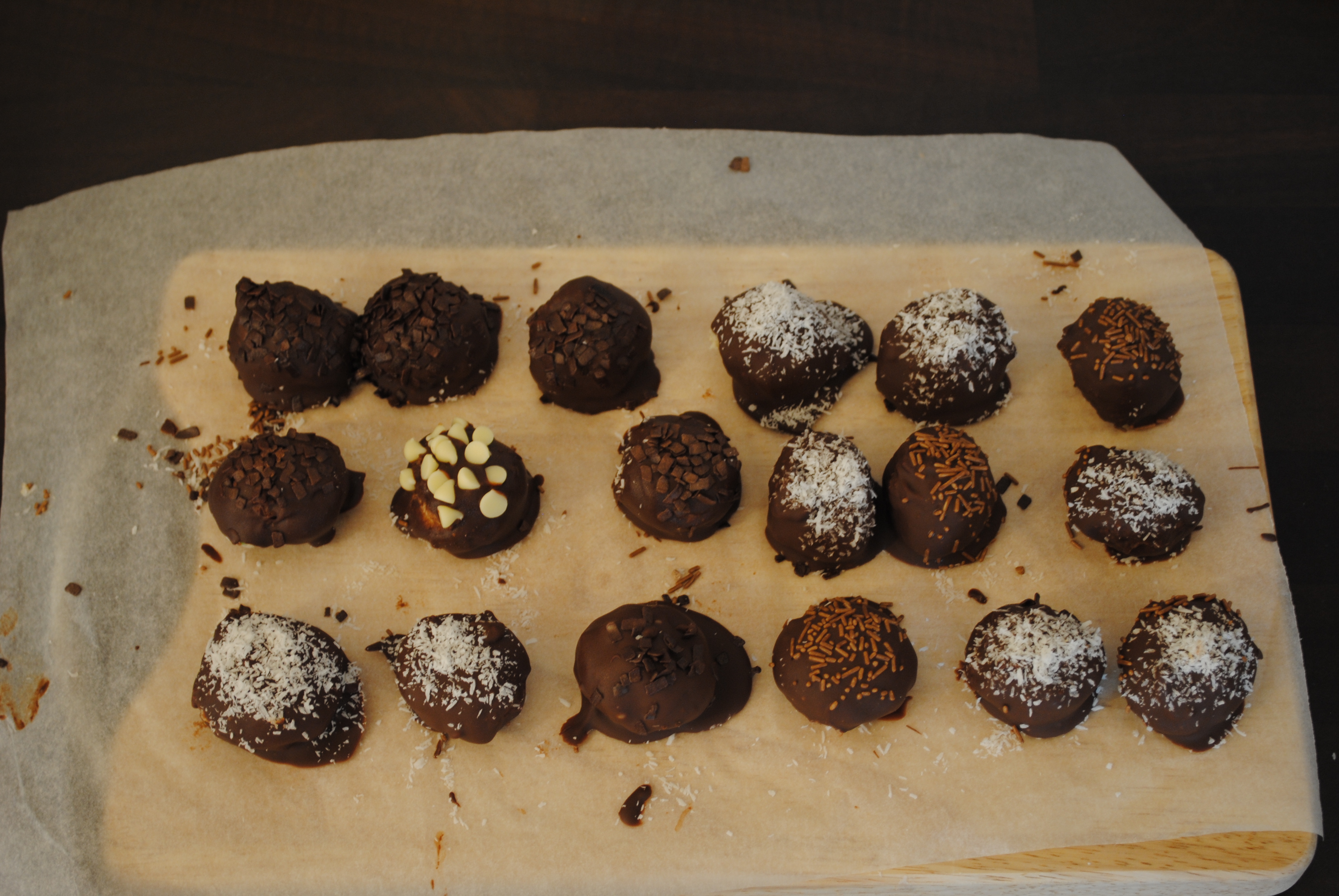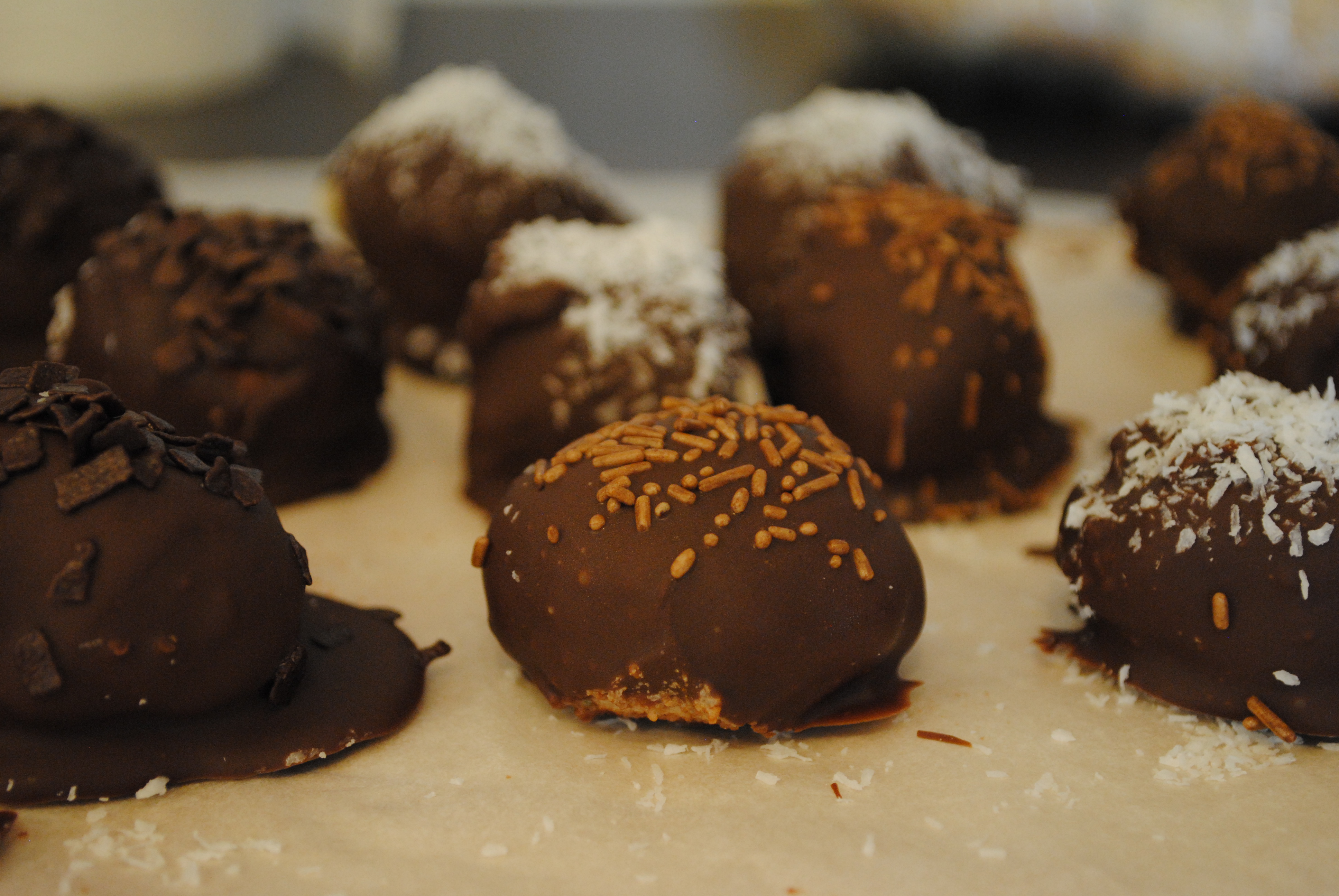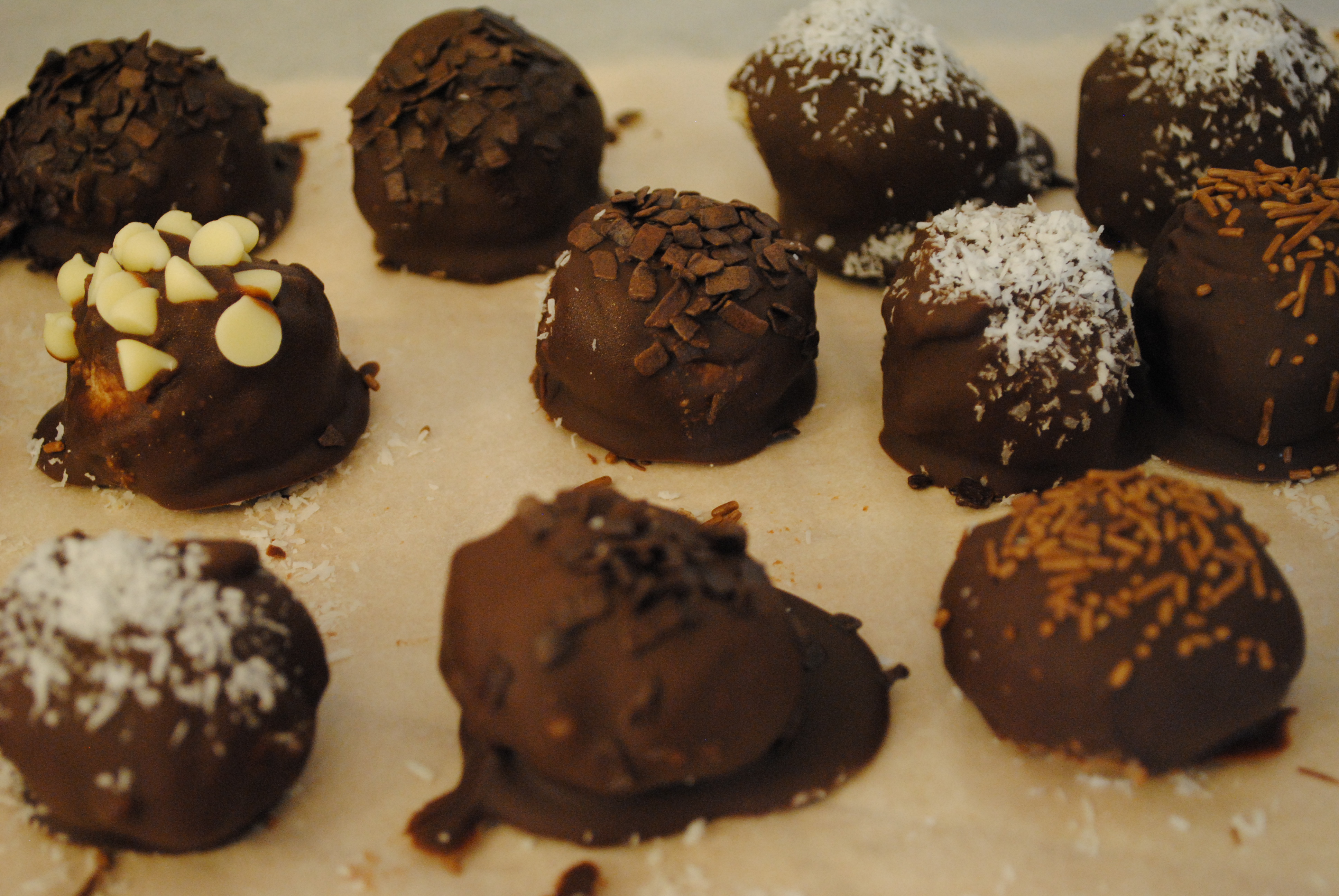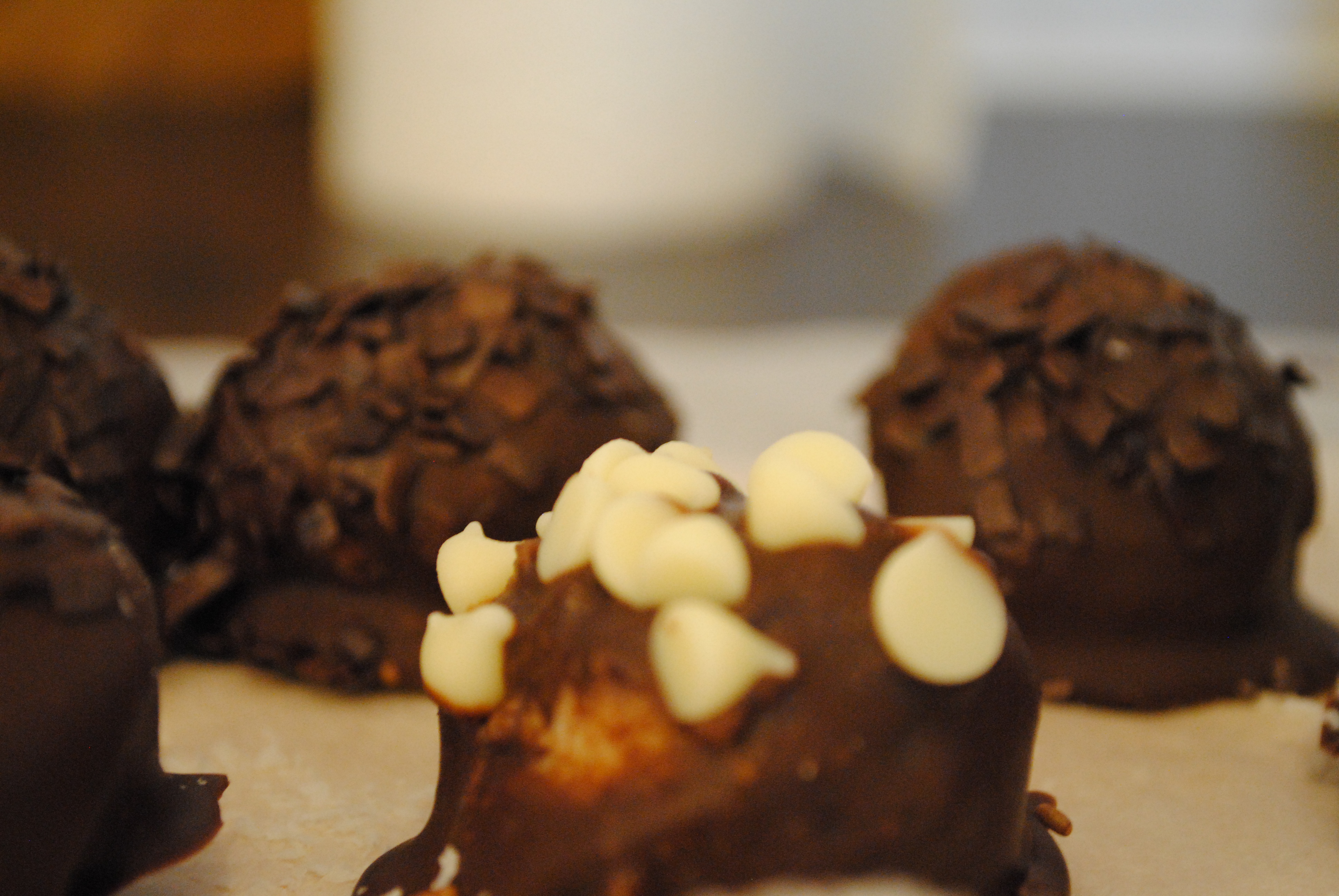 The beauty of these if you can pretty much sprinkle whatever you want onto the balls after you’ve dipped them in the chocolate. I chose to put coconut, chocolate sprinkles, dark chocolate shavings, and one crazy one with white chocolate chips which turned out to be a little too much for me to handle.