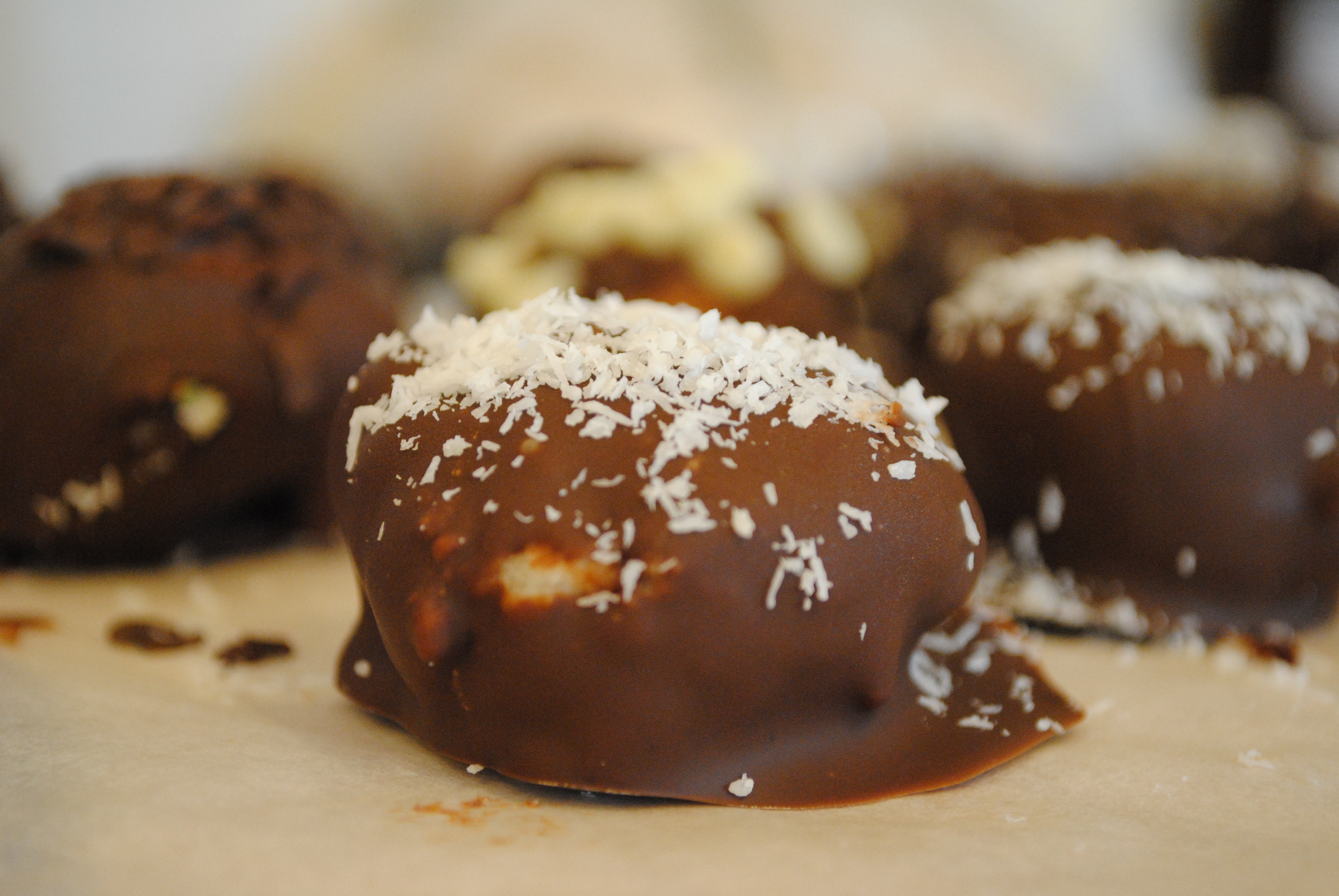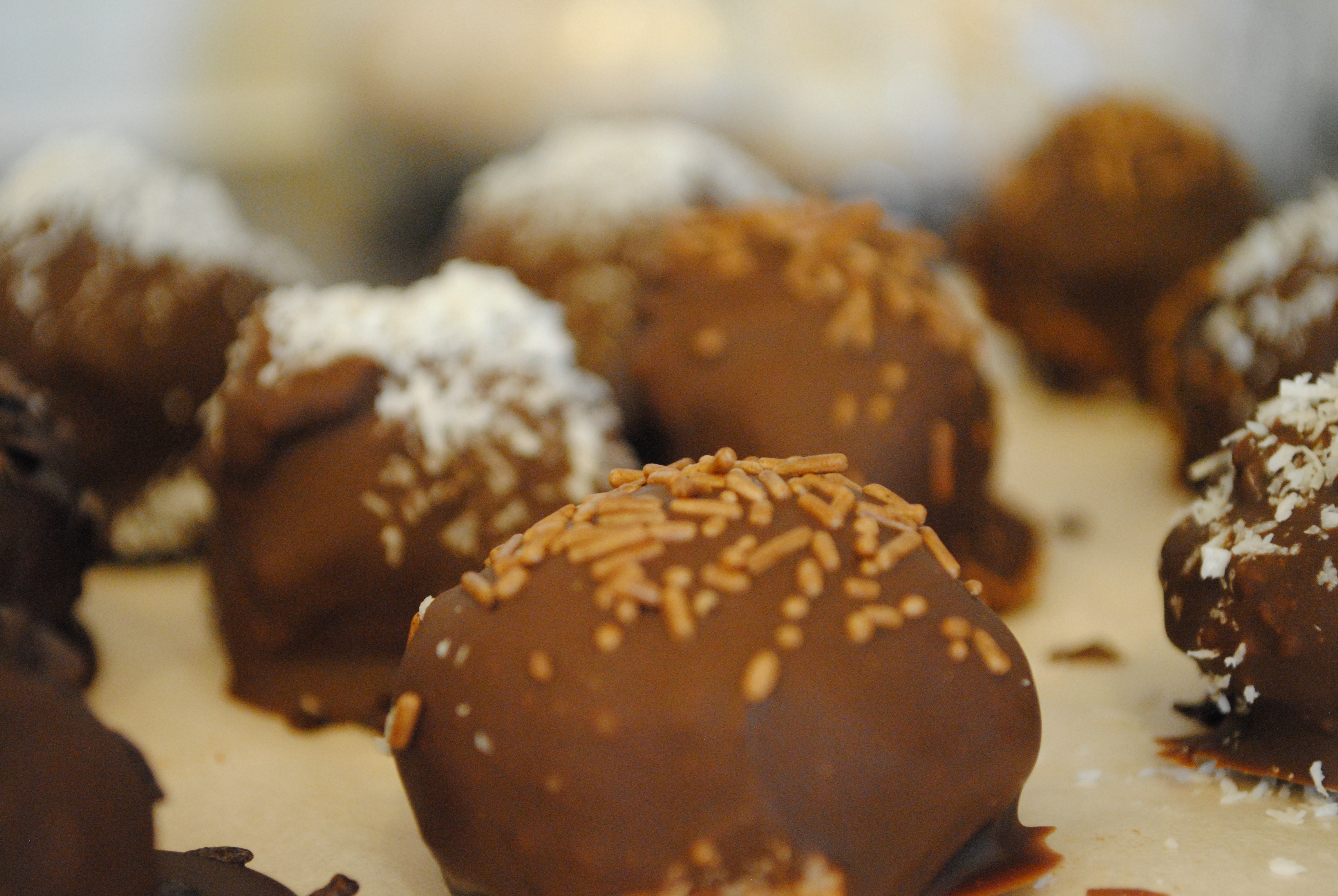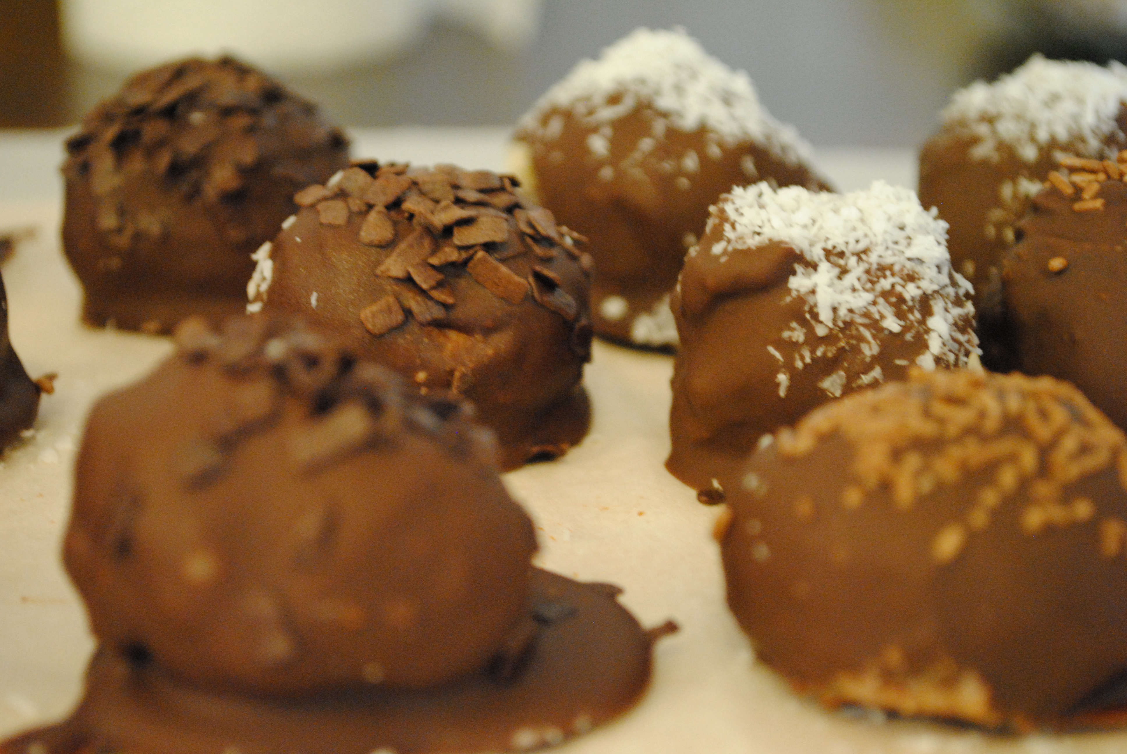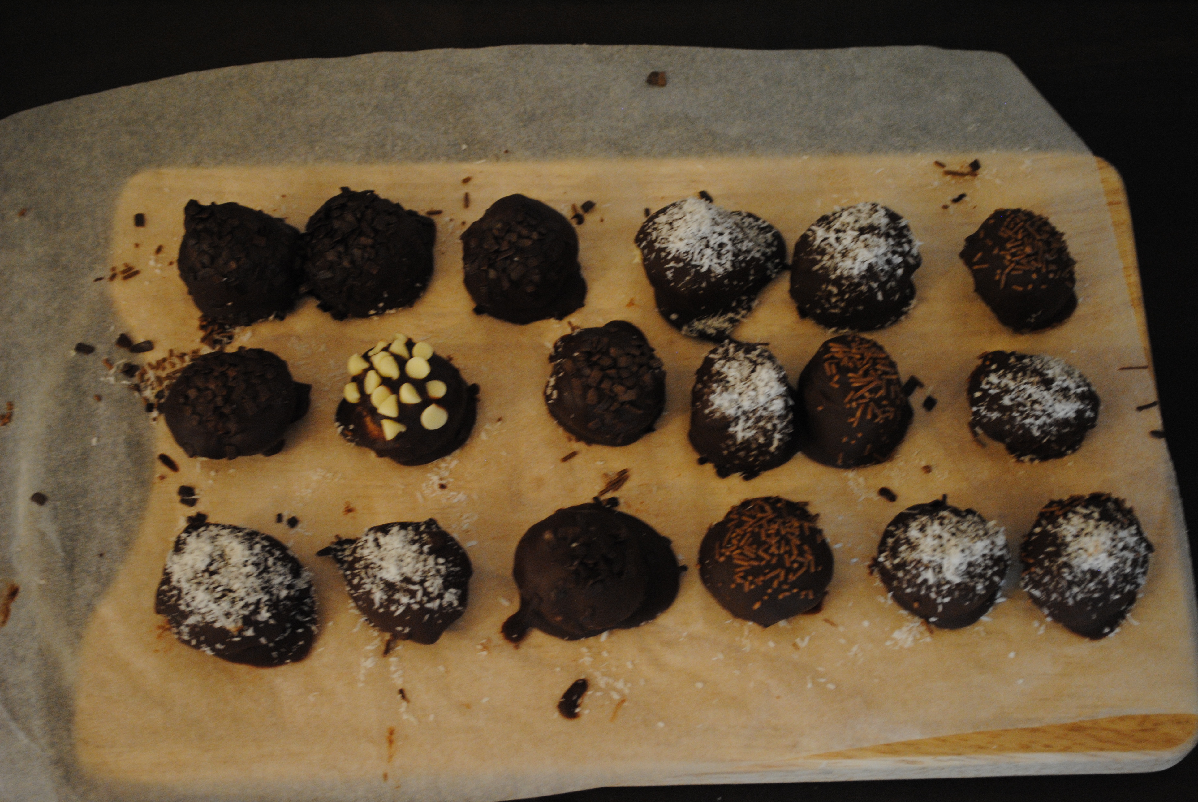 The beauty of these if you can pretty much sprinkle whatever you want onto the balls after you’ve dipped them in the chocolate. I chose to put coconut, chocolate sprinkles, dark chocolate shavings, and one crazy one with white chocolate chips which turned out to be a little too much for me to handle.