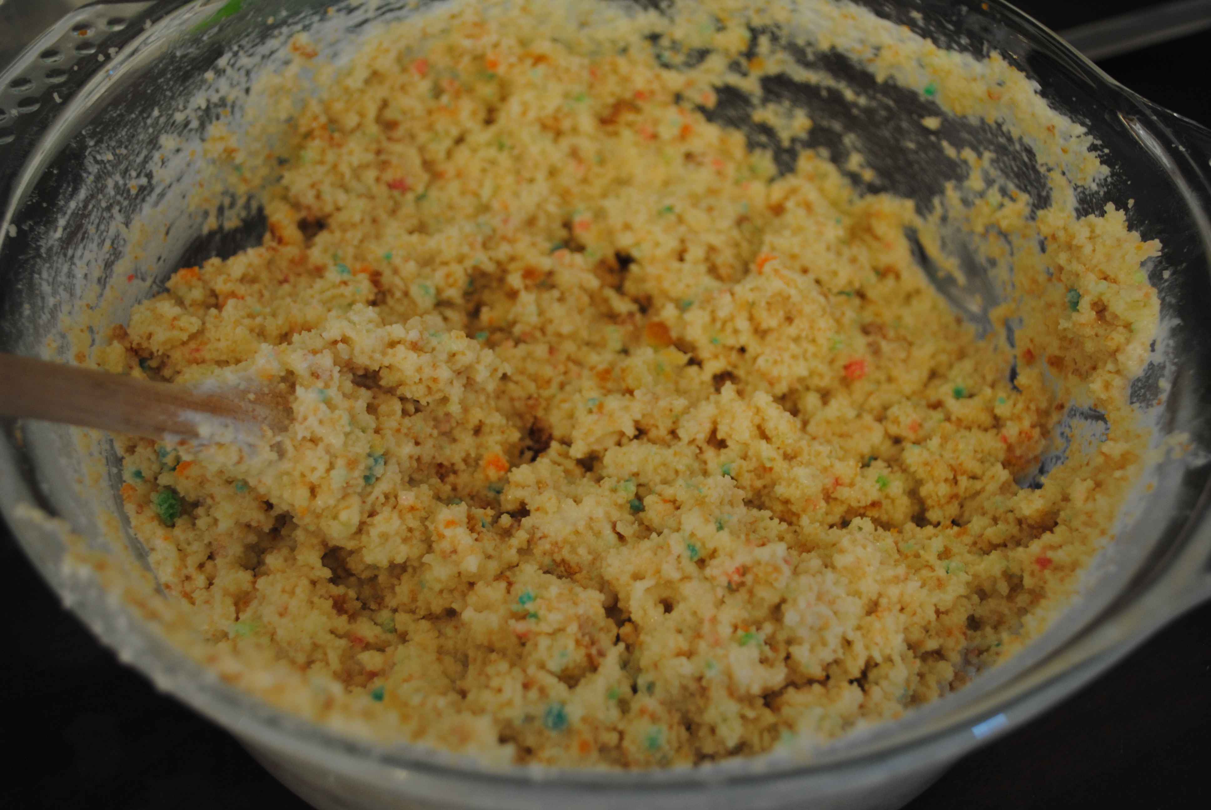 2) Once the cake has cooled, crumble the cake into a bow. Mix the entire tub of frosting with the crumbled cake- mix until the mixture is uniform and completely combined.