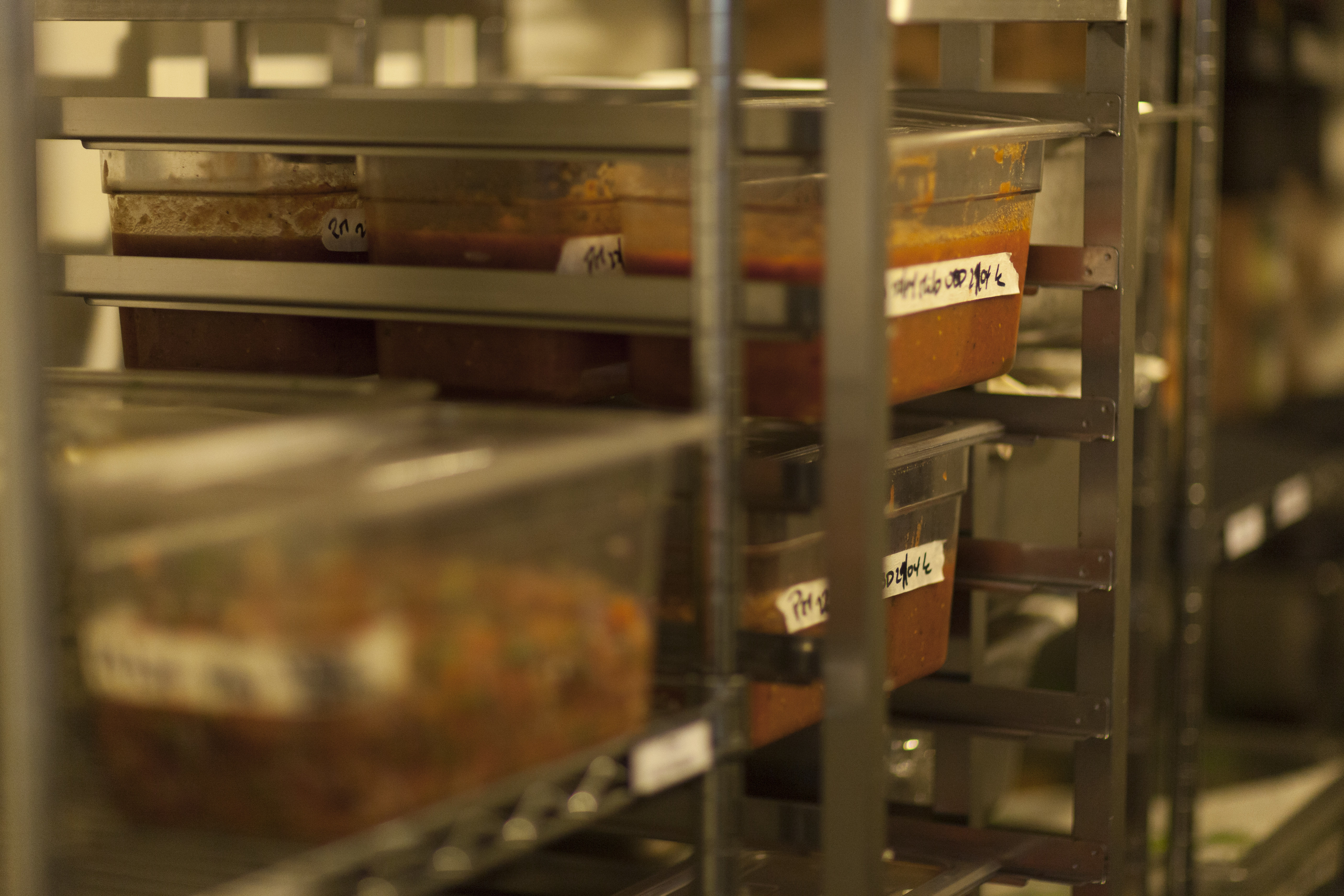 Anna takes me into the fridge where everything that has been prepared that morning is resting neatly in clearly labeled containers, stacked on the shelves waiting to be grilled or put out on the assembly line as needed. The fridge is surprisingly small yet orderly.