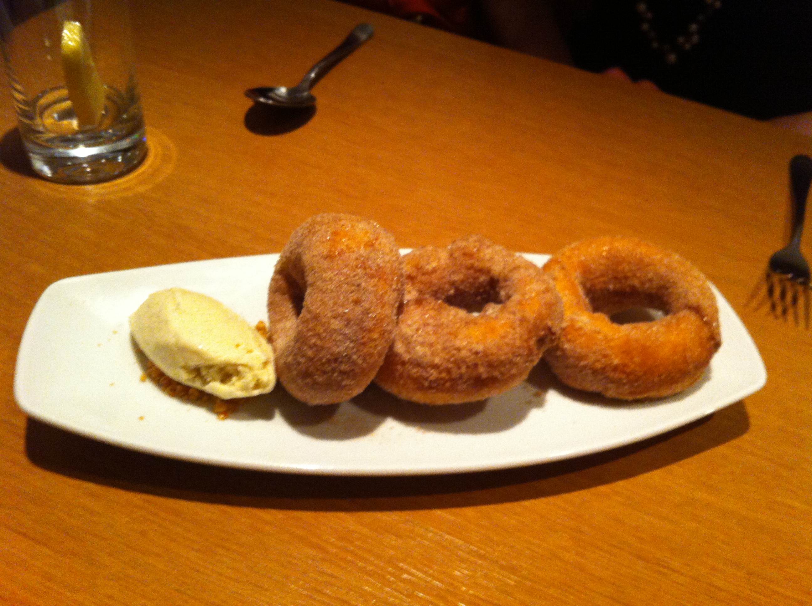 For dessert, the sugar cinnamon doughnuts with vanilla bean ice cream were decadent – the doughnuts were hot and fresh (had just been baked), and their pairing with the cool, creamy ice cream proved refreshing and sweet. Once again, perfectly complemented.