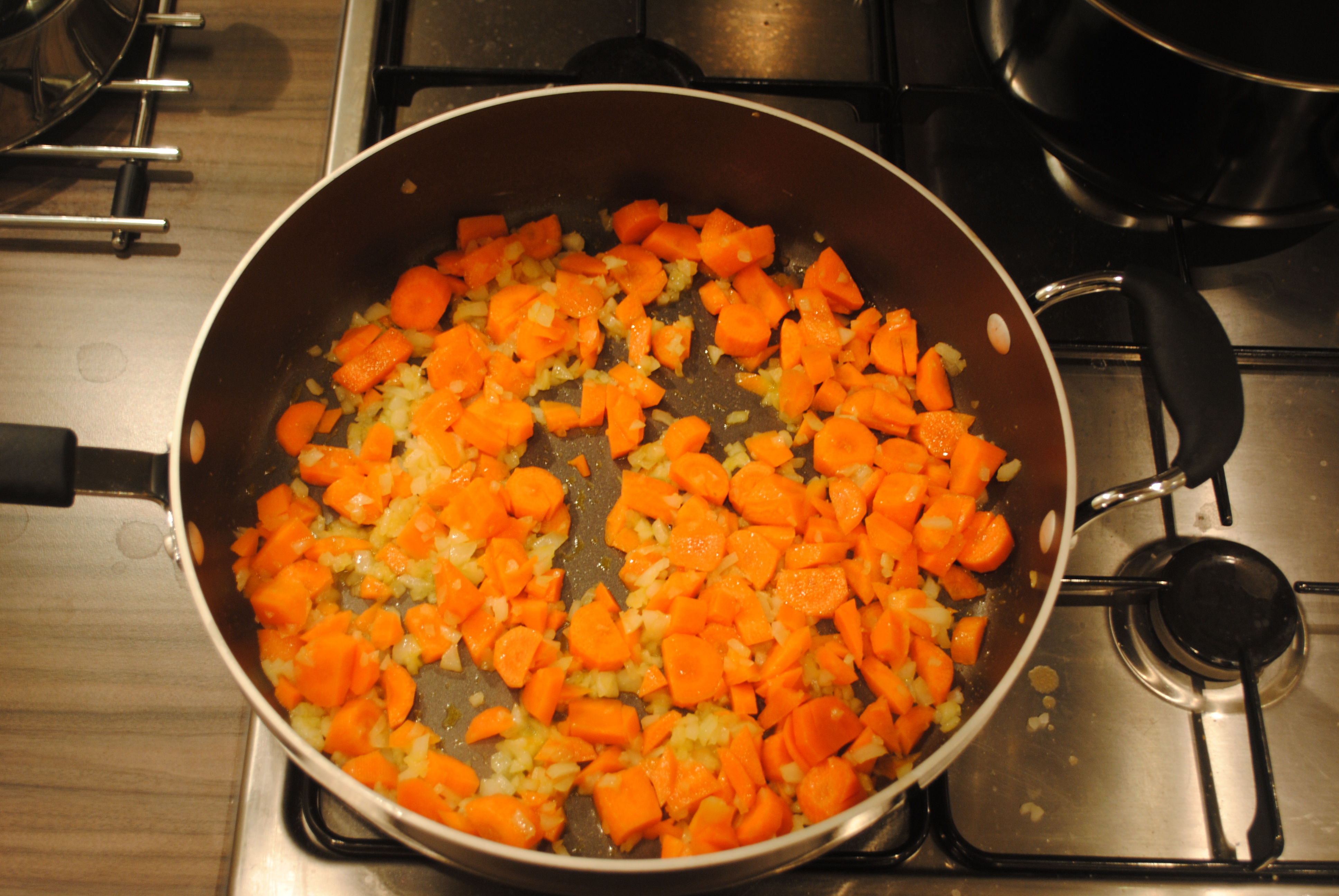 Heat the oil in a medium saucepan, then soften the onion and carrots for a few mins.