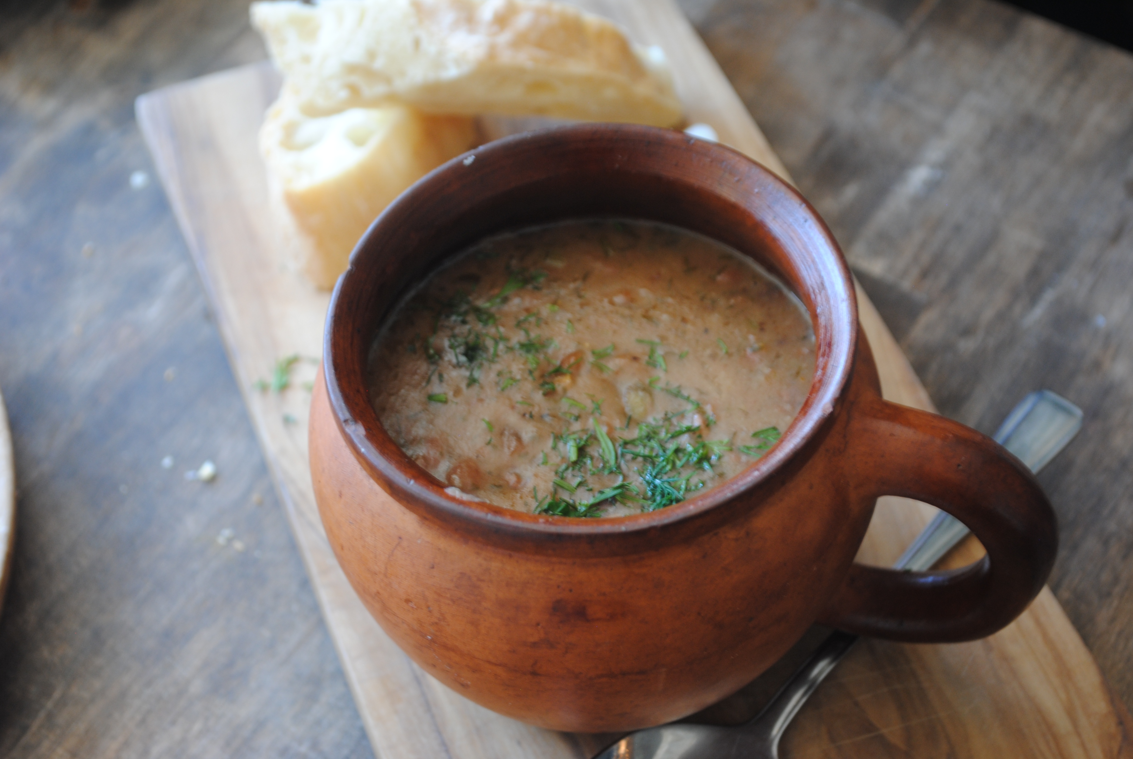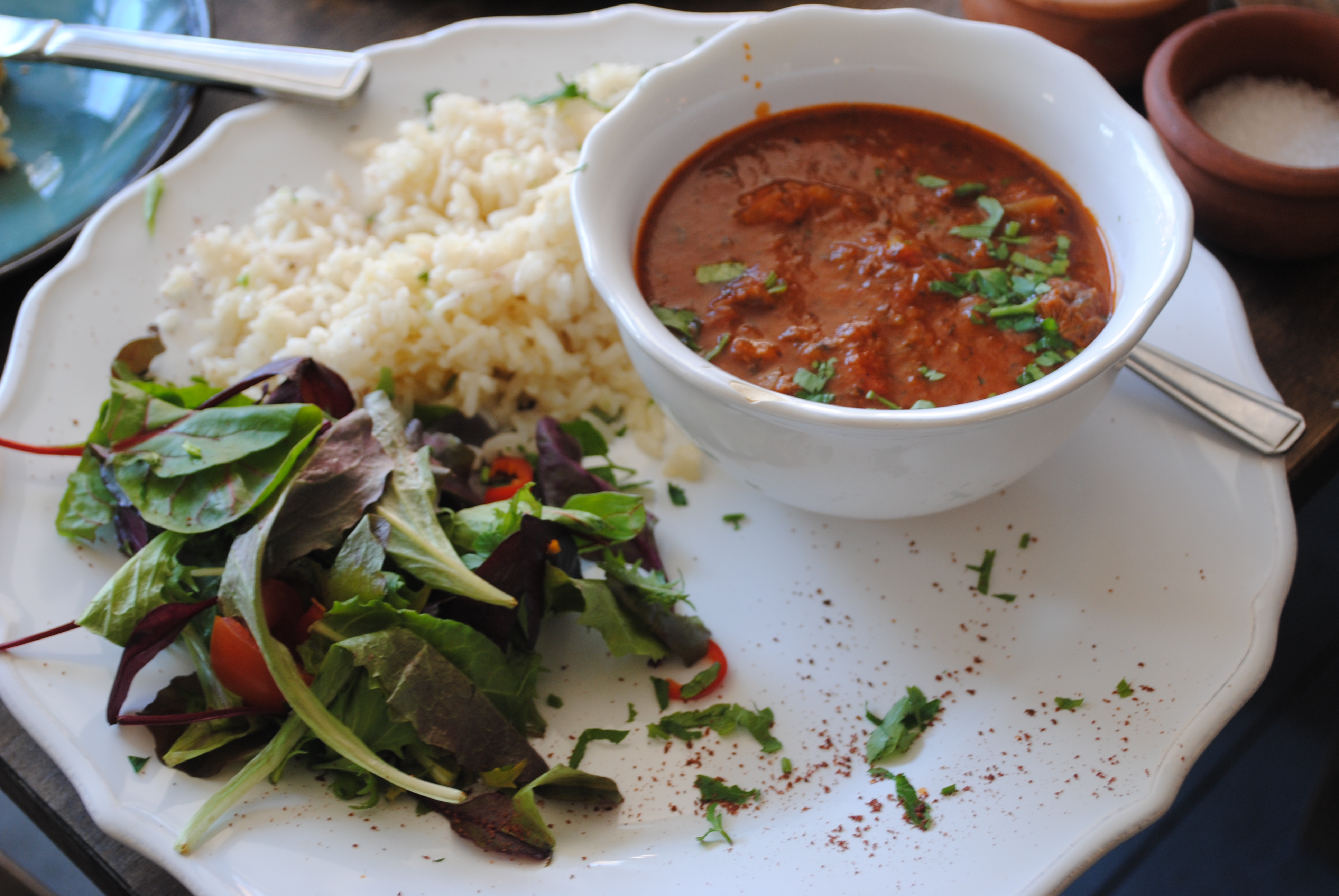 Cold starters include Russian salad (a filling mix of potato, carrot, spring onion, pea, egg, dill and mayonnaise); Lobio salad, red kidney beans mixed with onions and coriander and Georgian spices; or you can opt for the Meze plate which gives you a little bit of everything to sample — walnut stuffed aubergines and red peppers; mushroom salad; spinach pate; green bean salad; and of course the Russian salad, served with cheese or bean bread. Very vegetarian friendly I might add..