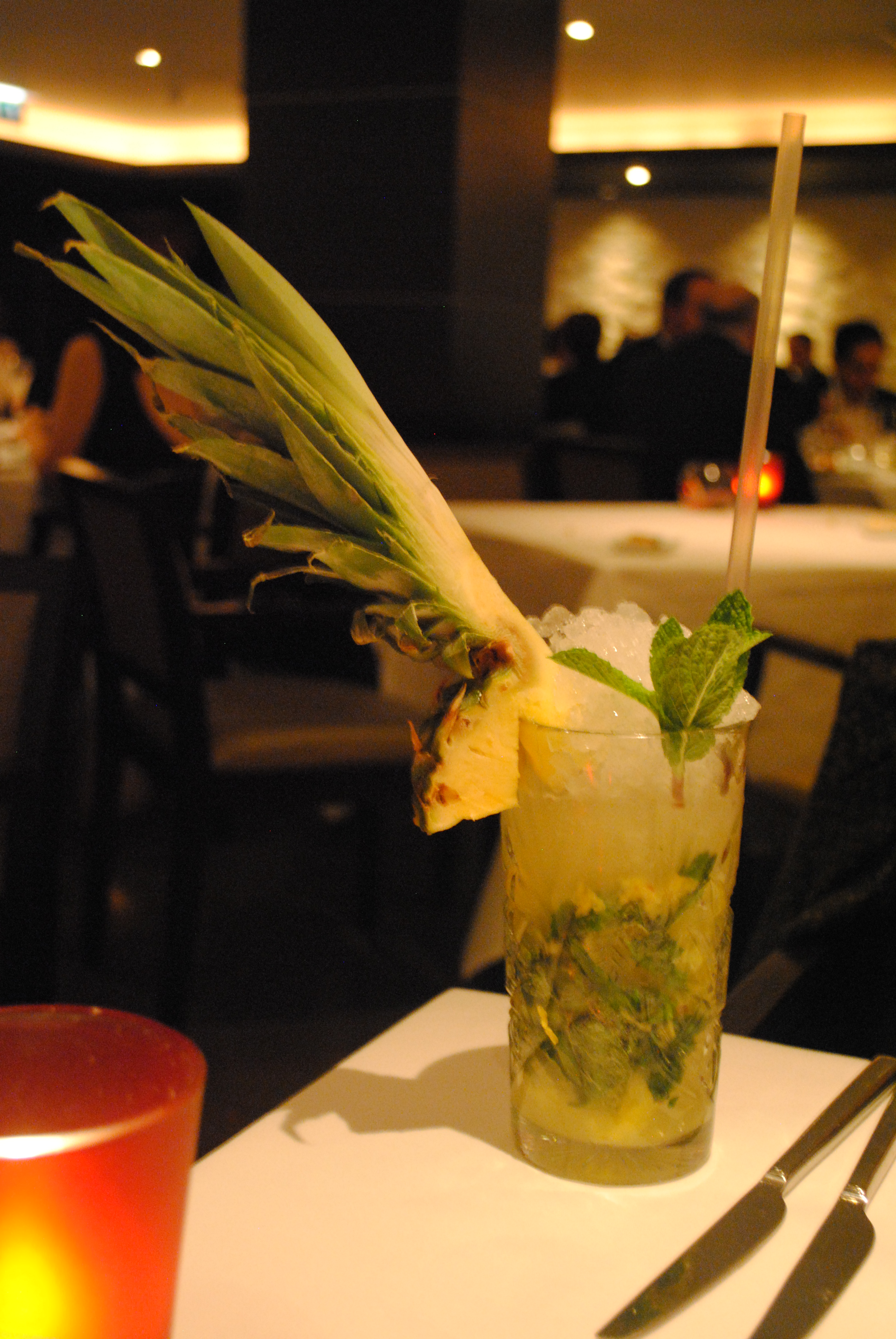 Now would be a good time to share the amusing anecdote that the pineapple featured in the above photo fell off the glass and landed somewhere on the restaurant floor away from the table. The waitstaff, being the super efficient trained people they are, promptly delivered another pineapple head on a folded napkin on a silver tray bringing much amusement to the table.
