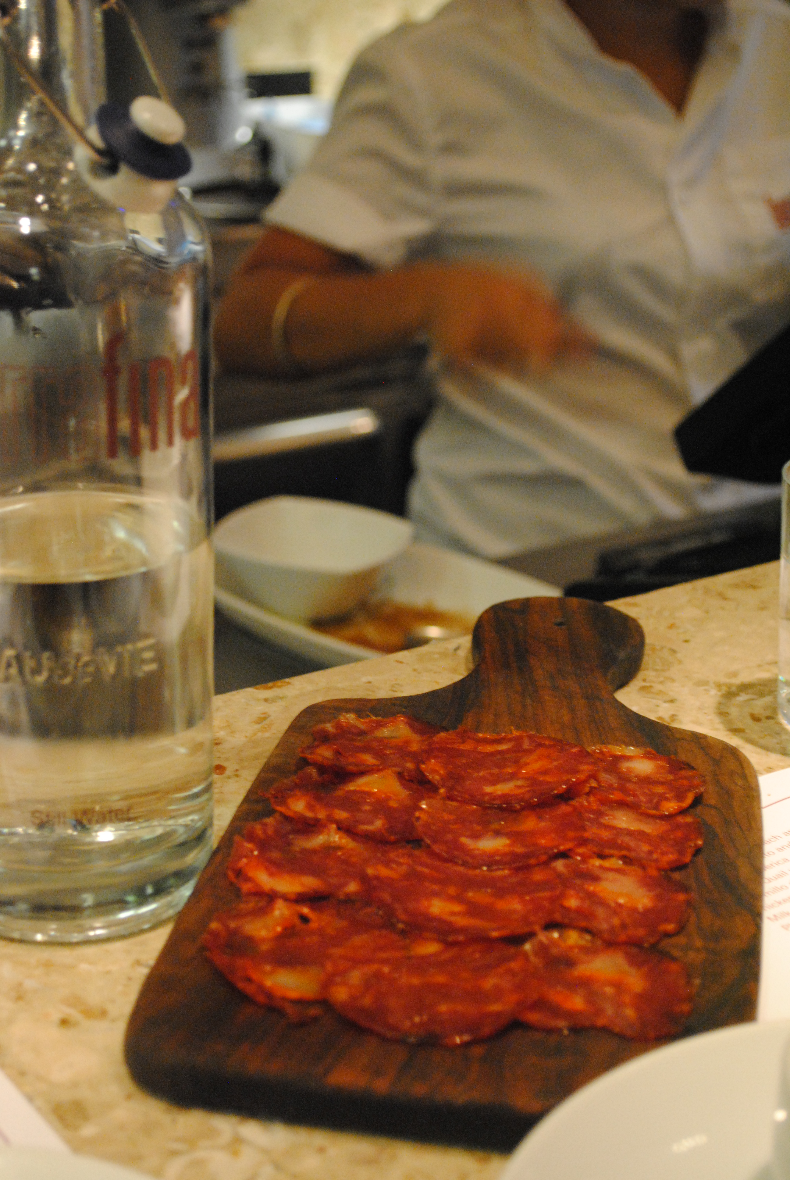 The platter of chorizo ibérico de bellota is perfectly thinly sliced, fiery and oily.