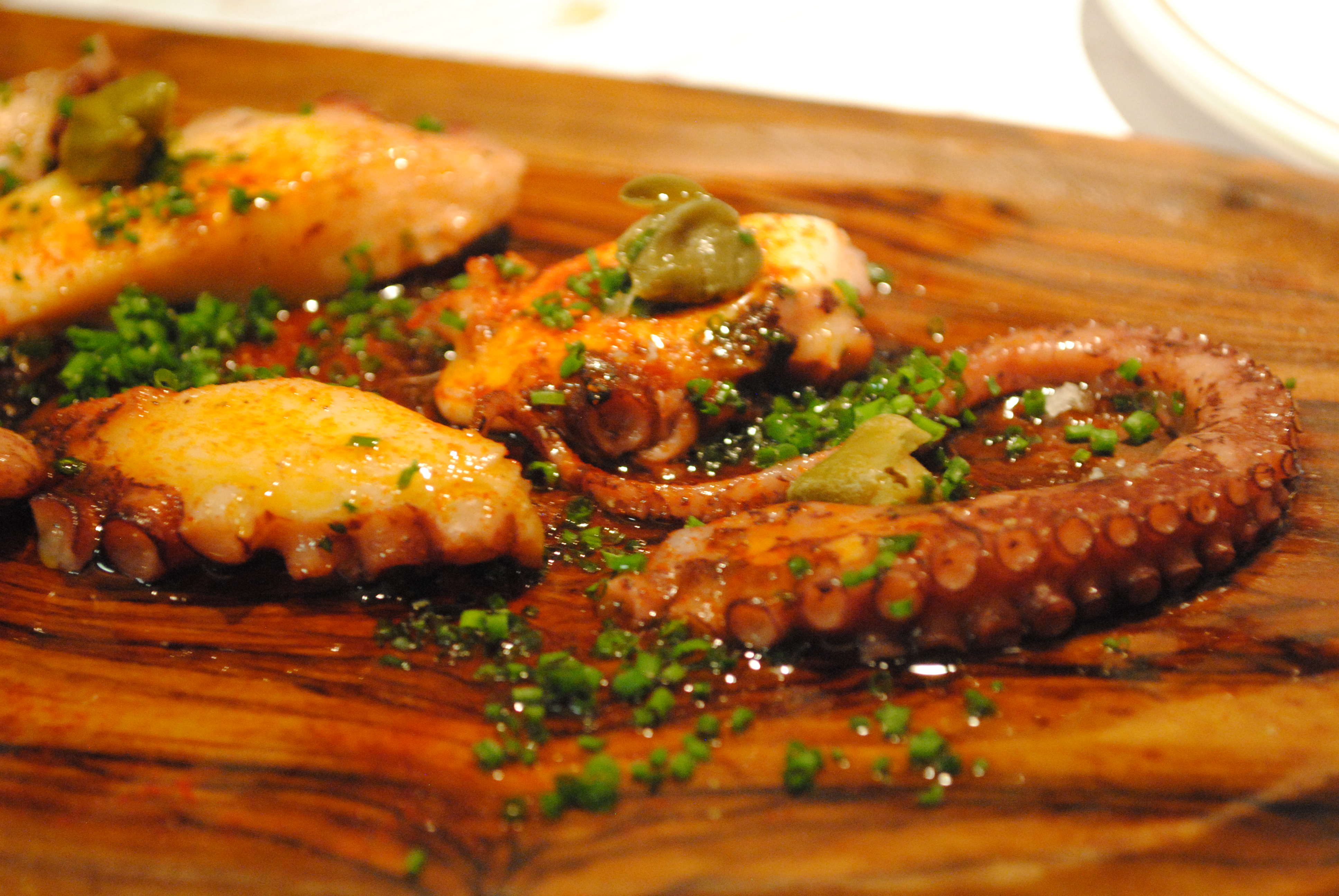 Octopus is sliced thin and boiled to a soft texture, topped with olive oil and a dusting of mild paprika and capers.
