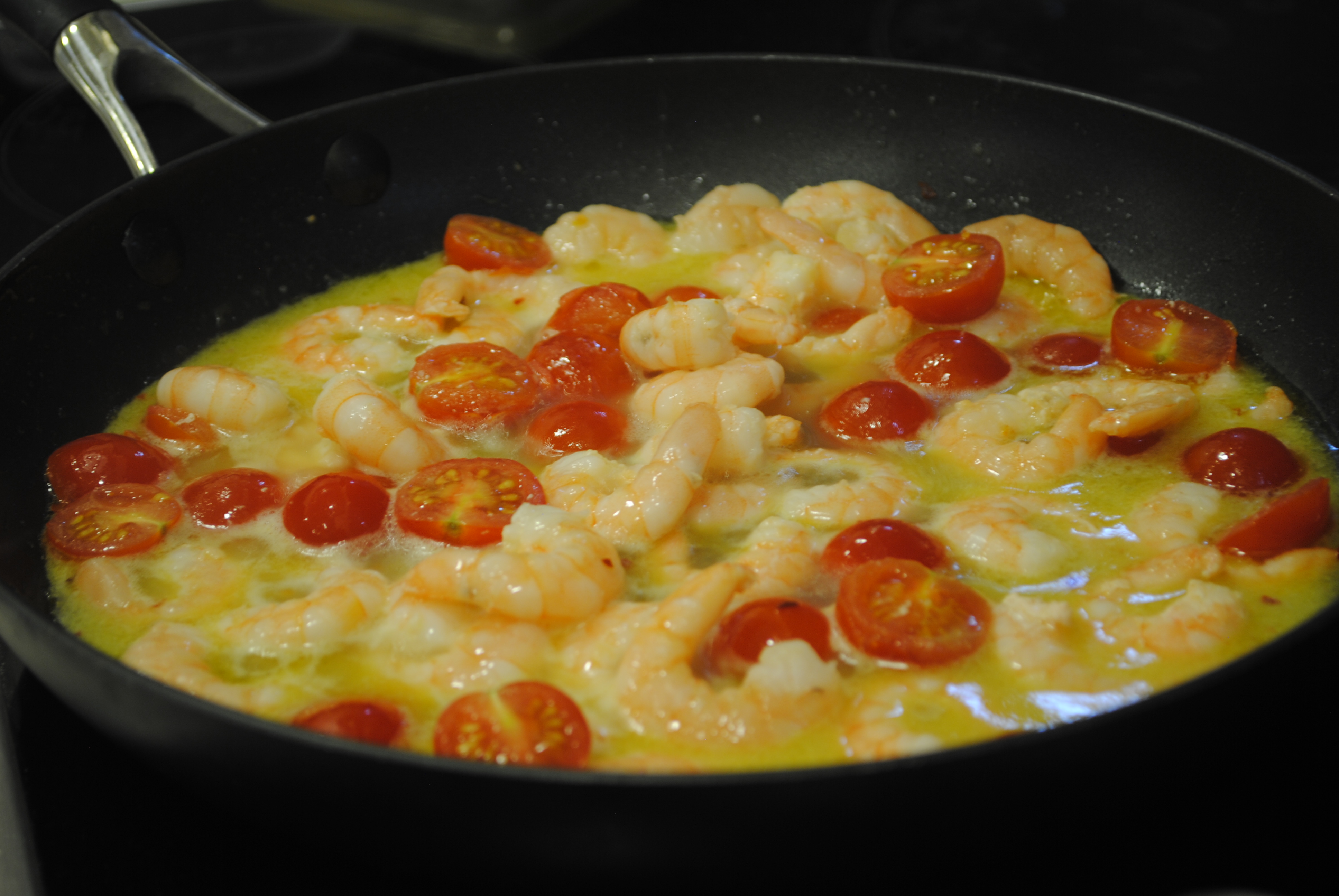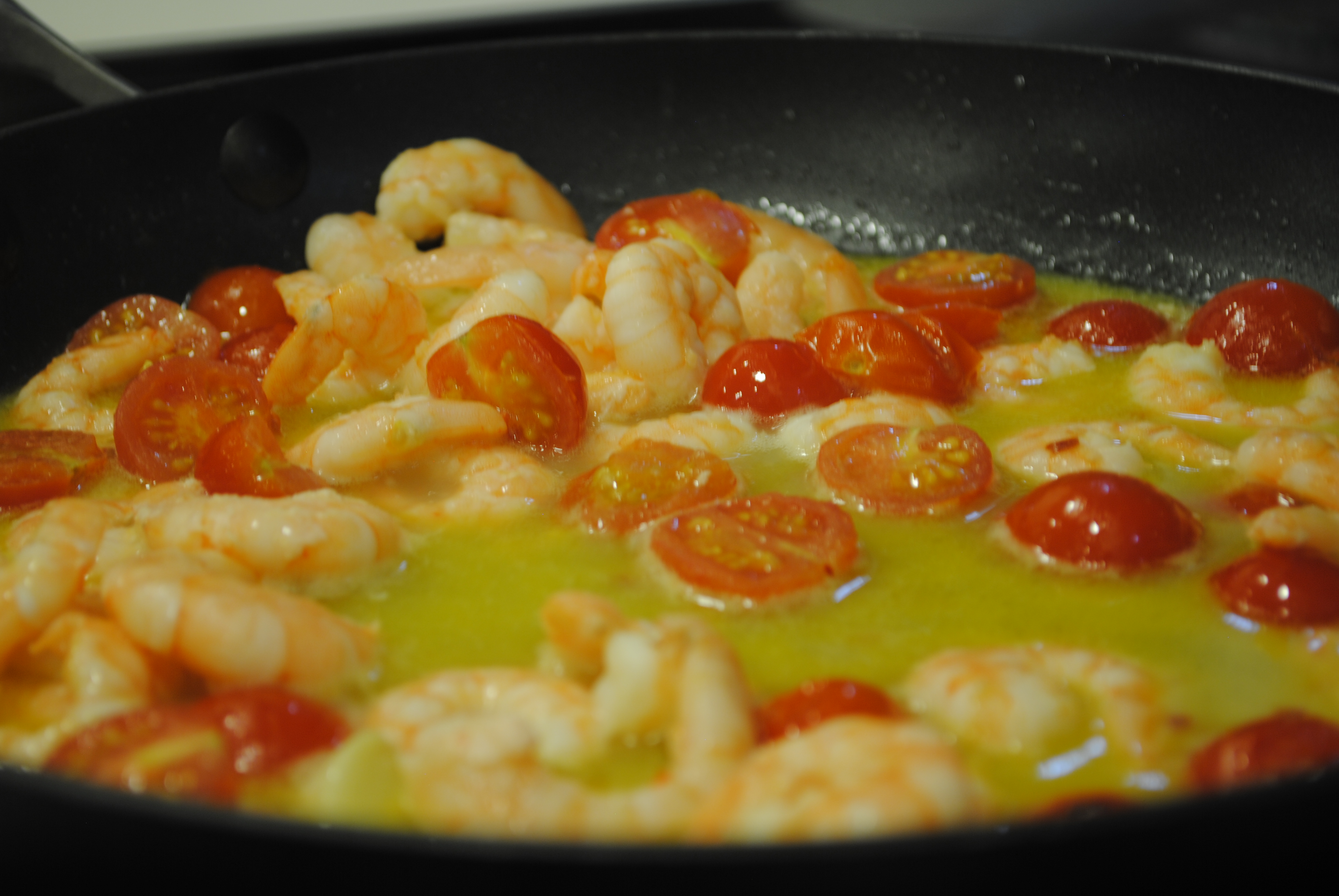 Heat 3 tbsp of olive oil in a frying pan and fry the two diced garlic cloves for 30 seconds. Add the prawns, cherry tomatoes and chilli flakes. Fry until the prawns are pink. Season with salt.