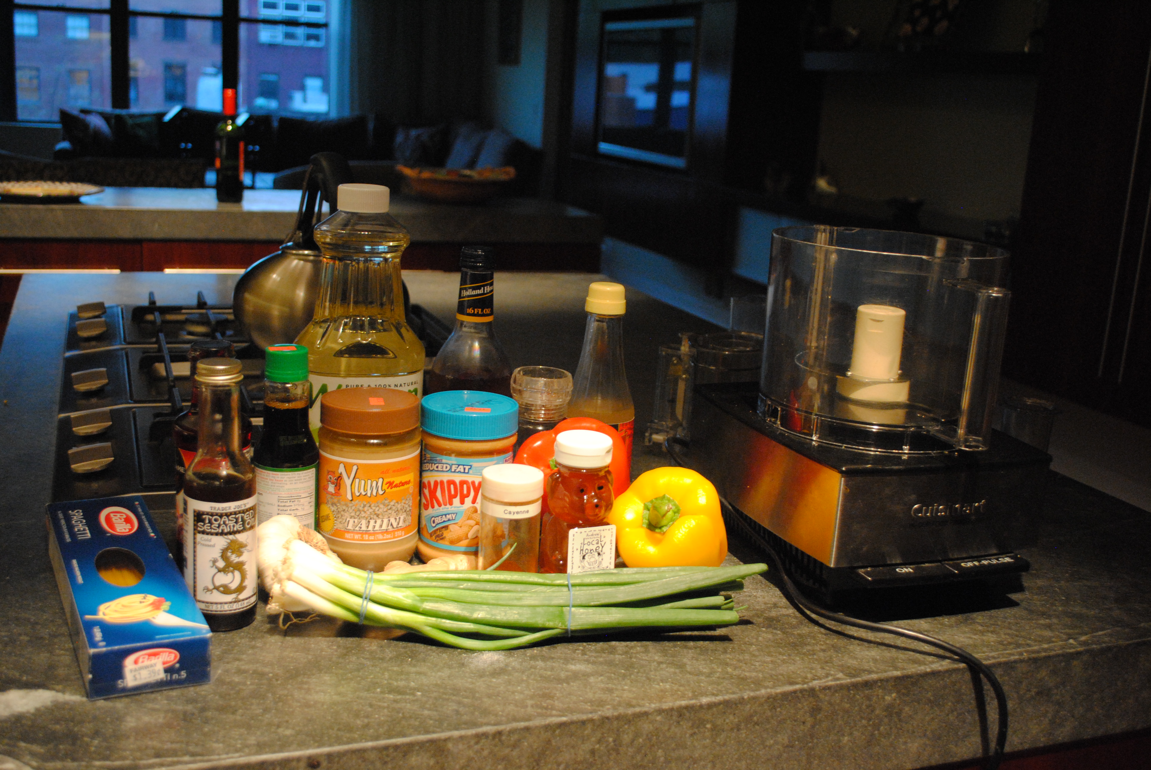One summer the Cooking Studio entailed a whole week’s worth of classes. Day Three, “Asian Celebration,” involved making some amazing Szechuan noodles that were so delicious, I have kept the recipe, stained in oil with smears of peanut butter and tahini, for the past 12 years or so. Having not been in possession of a food processor in London, I thought it was high time to write this one up now that I have access to some very handy kitchen gadgets.