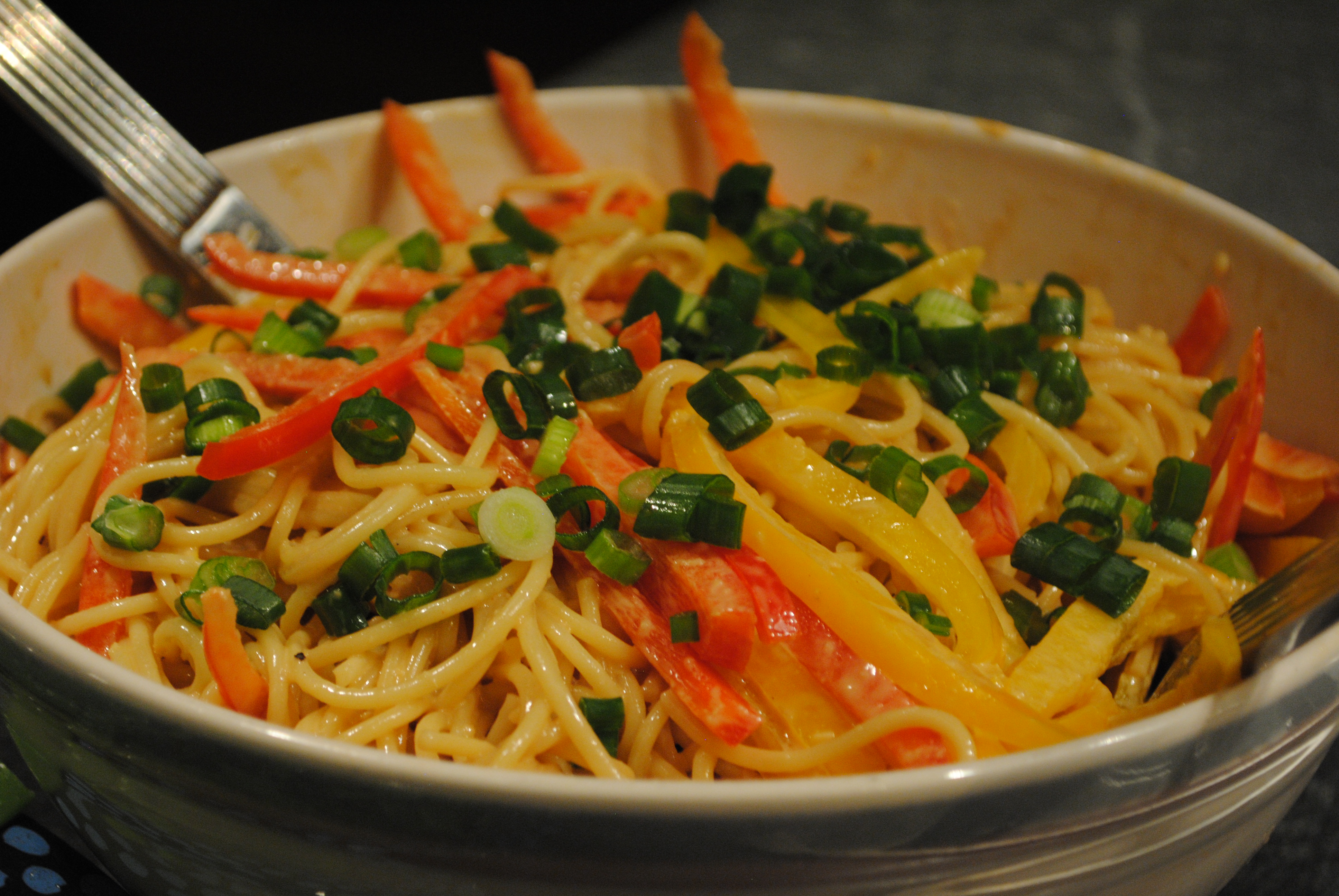 Add a splash of oil to a large pot of boiling salted water and cook the spaghetti al dente. Drain the pasta in a colander, place it in a large bowl, and while still warm, toss with 3/4 of the sauce. Add the red and yellow bell peppers and scallions; toss well. Serve warm or at room temperature. The remaining sauce may be added, as needed, to moisten the pasta.
